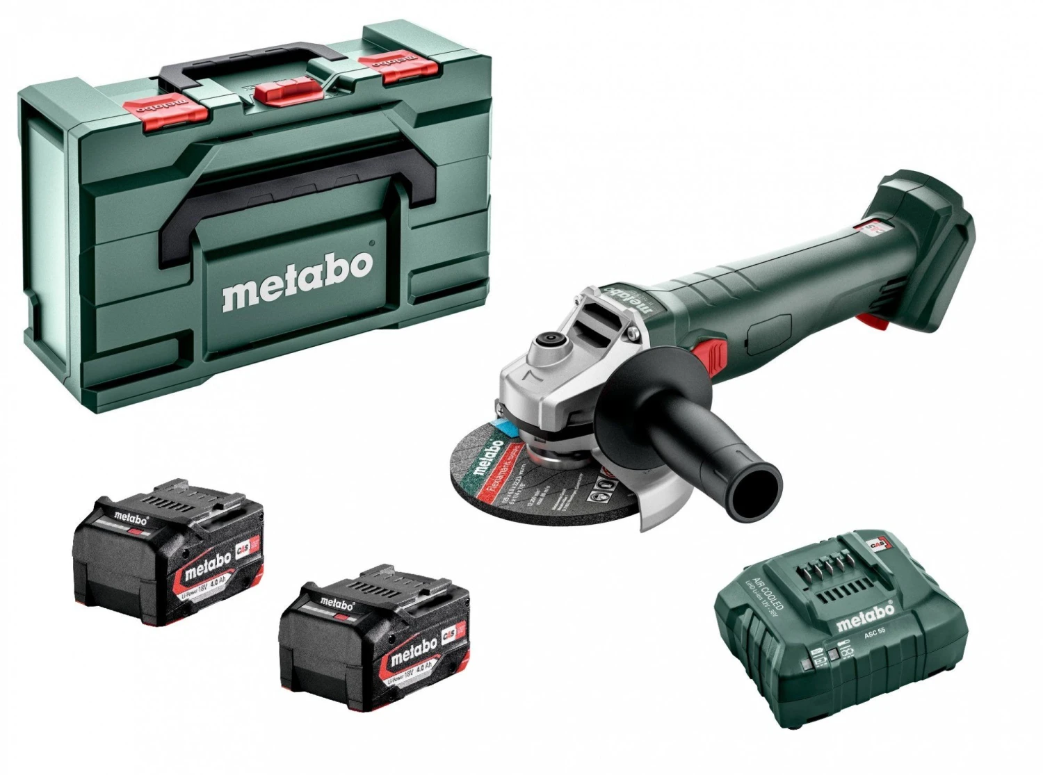 beschermkap, steunflens, Spanmoer, Extra handgreep, pensleutel, 2 Li-Power accu-packs (18 V/4,0 Ah), Lader ASC 55 “AIR COOLED”, metaBOX 165 L